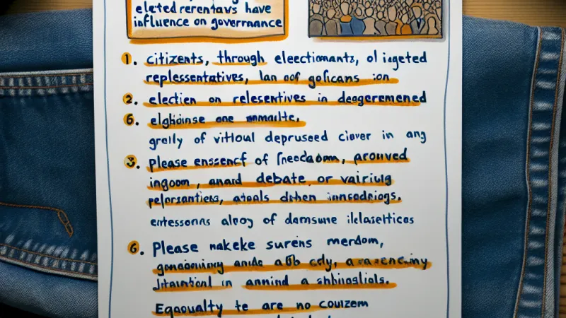 Democratie betekent dat burgers via gekozen vertegenwoordigers invloed hebben op het bestuur. Vrijheid, debat en verschillende stromingen zijn essentieel.
